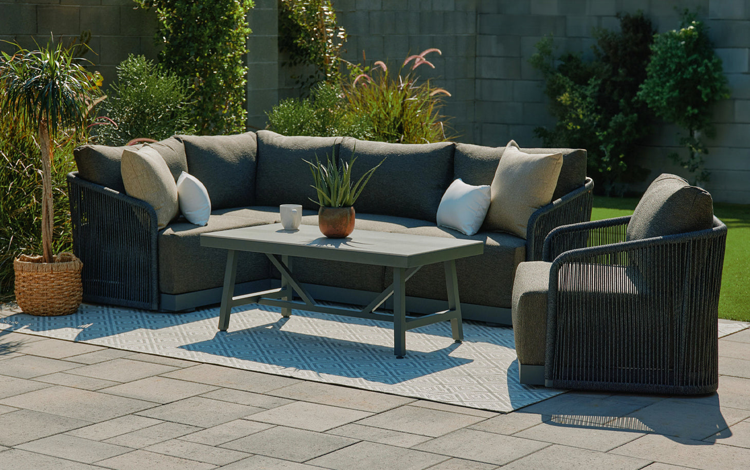 The Villa collection features sleek, sloped arms with carbon-colored woven rope wrapped around a graphite-colored aluminum frame. Its clean, modern design offers understated luxury for any outdoor space.