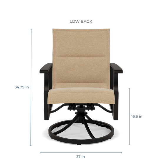 - Low-Back: Our low-back option is designed for a minimalistic look, standing 7.25" shorter than our high back ​padded sling. It ensures an unobstructed view, perfect for spaces where you want to maintain openness and enjoy an unobstructed view.